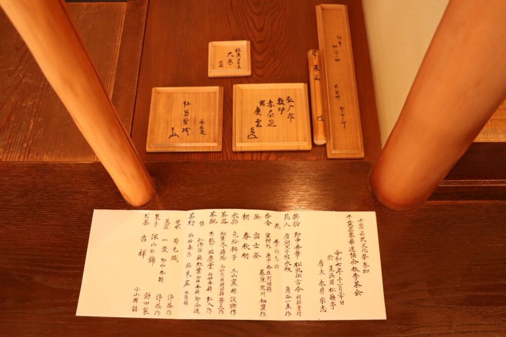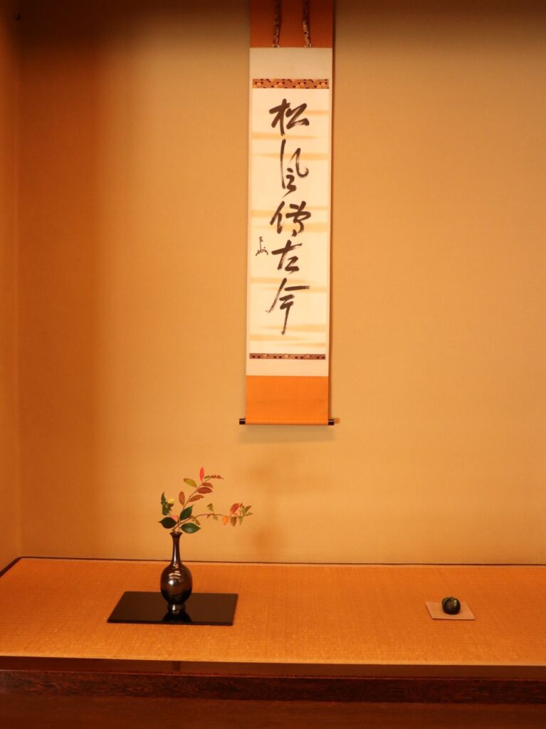 亭主が用意したのは、松風(松を通り抜ける風)の音は、時代が移り変わっても変わらないように、普遍的な大切な教えが、今も昔も変わらずに人々の心に響き続けることを表しているという禅語の掛け軸でした。