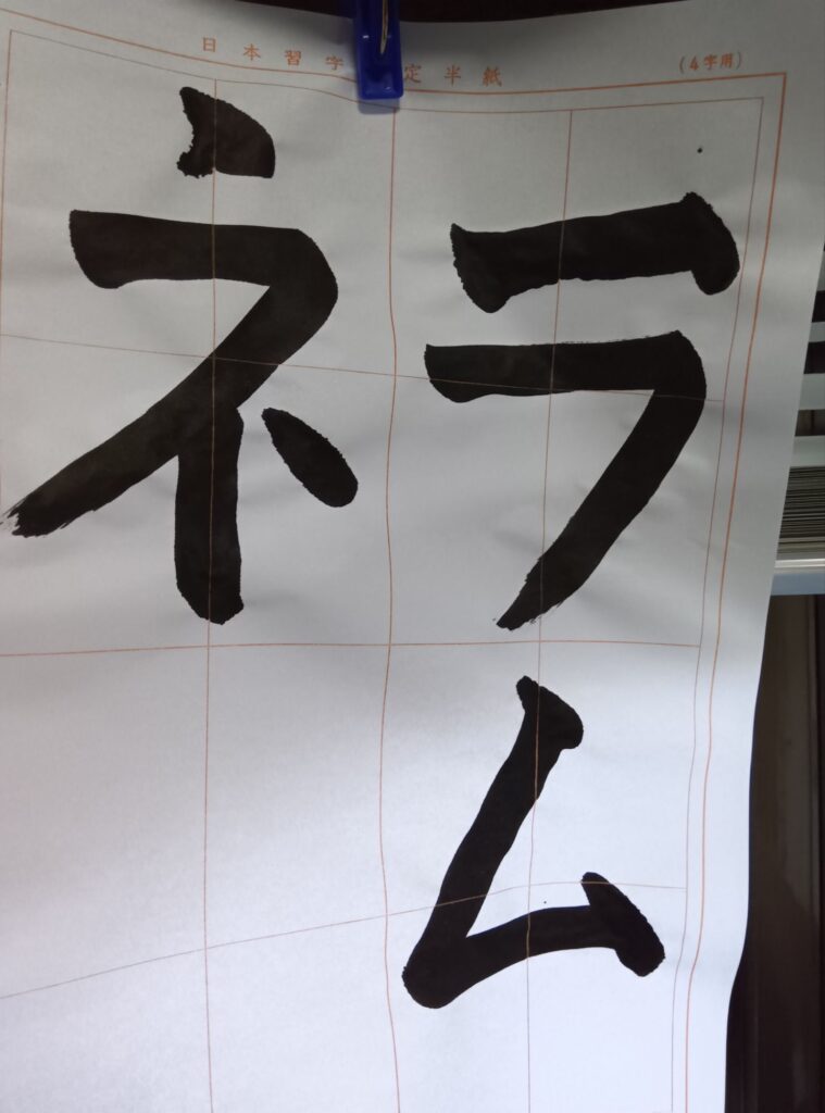 9月24日低学年教室 2025年9月26日 最終更新日時 : 2025年9月26日 hcc76279 提出作品完成。カタカナはかなりバランスが取りづらかった印象。何枚かいても納得はいかなかったので集中力がまだ残っていた時の作品に決まりました。
