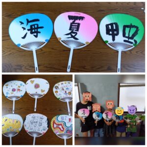 七夕競書課題も終わり、条幅も書き終えたので、みんなが楽しみにしていたうちわづくりをしました。みんな素晴らしい出来で、ものすごくいい経験になりました。